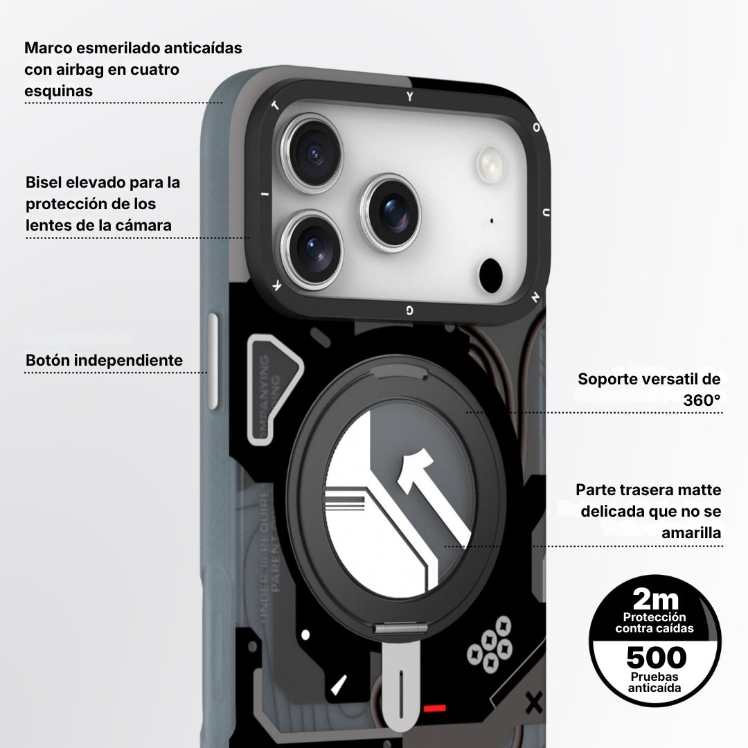 Te presentamos la funda para iPhone inspirada en el estilo cyberpunk, que destaca por sus colores vivos y llamativos que capturan la esencia de un mundo cibernético.